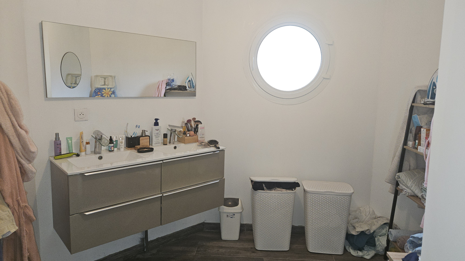 Il se compose d’un vaste séjour lumineux, d’une cuisine entièrement équipée, d’une buanderie attenante avec accès direct au garage, et d’un espace nuit comprenant deux chambres ainsi qu’une salle d’eau, avec possibilité d’y installer une baignoire.